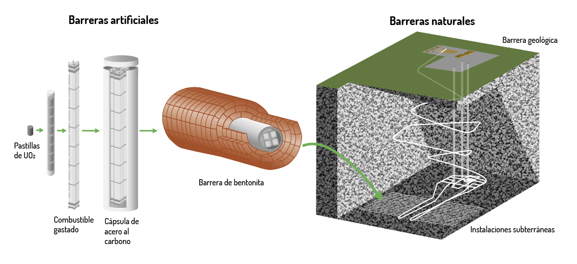 Un Almacén Geológico Profundo (AGP) consiste en el aislamiento de los residuos radiactivos de alta actividad mediante la interposición de una serie de barreras en instalaciones de almacenamiento a profundidades generalmente alrededor de los 500 metros, donde los residuos se introducen primero en contenedores de metal extremadamente duraderos y resistentes y, posteriormente se disponen en galerías en formaciones geológicas estables, taponadas con materiales absorbentes y rodeadas de terreno de baja permeabilidad y con gran capacidad de retención.