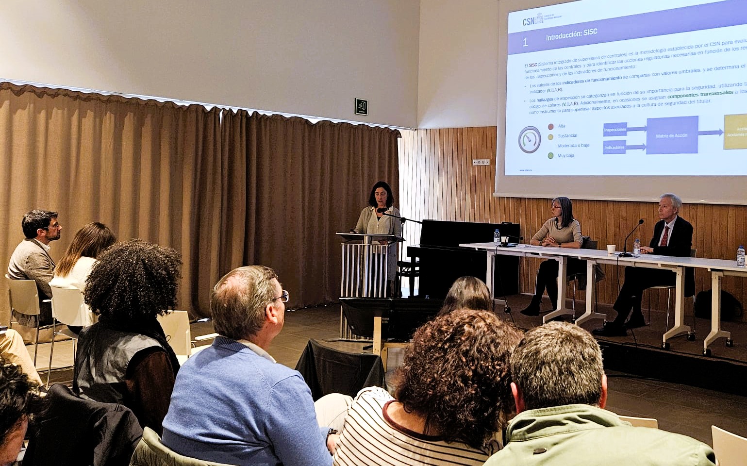 Las jefas de proyecto de Vandellós II y Ascó, Carmen García de la Rúa e Irene Cuarental, respectivamente, han expuesto el trabajo del CSN en la supervisión de ambas plantas, detallando el papel del Sistema Integrado de Supervisión de Centrales Nucleares (SISC) como herramienta fundamental para garantizar su seguridad. Complementando la información ofrecida por el regulador, el coordinador de Instalaciones Nucleares del CSN, Francisco Gallardo, ha presentado la estrategia de gestión de residuos radiactivos de alta actividad y los proyectos de Almacenes Temporales Individualizados (ATI) de capacidad total en construcción.